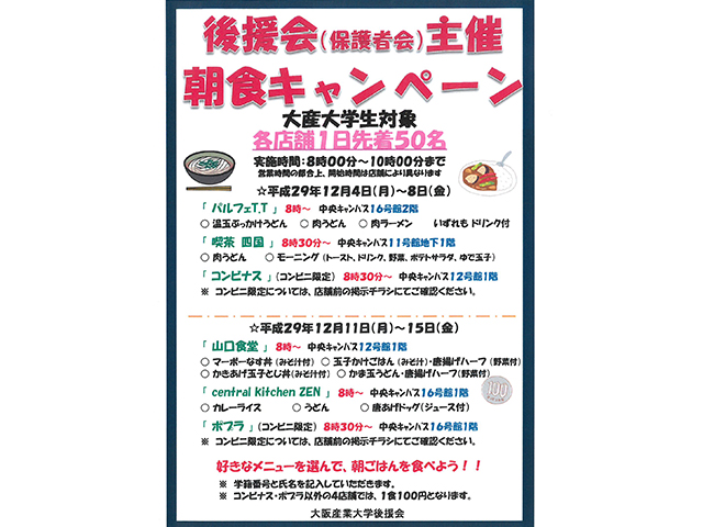 後援会(保護者会)主催 大産大学生対象 朝食キャンペーン