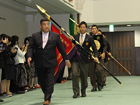 大阪桐蔭高等学校吹奏楽部の演奏に合わせて、優勝旗を手にした硬式野球部の選手が入場すると、会場は大きな歓声と拍手に包まれました。