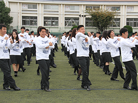 生徒達は、学園創立90周年を祝い、それぞれが楽しみながら、制服バージョンと学園創立90周年記念Tシャツバージョンの2パターンを踊り大いに盛り上がりました。