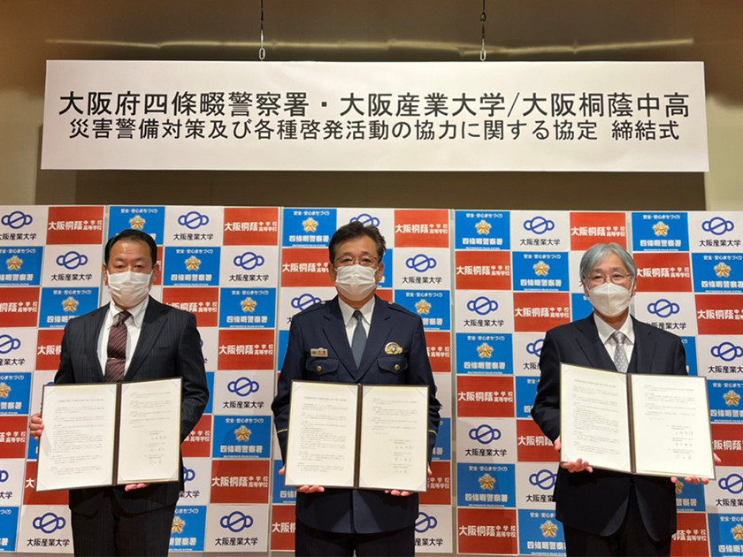 この度、大阪府四條畷警察署と大阪産業大学・大阪桐蔭中学校高等学校との間に、「災害警備対策及び各種啓発活動の協力に関する協定」を締結しました。